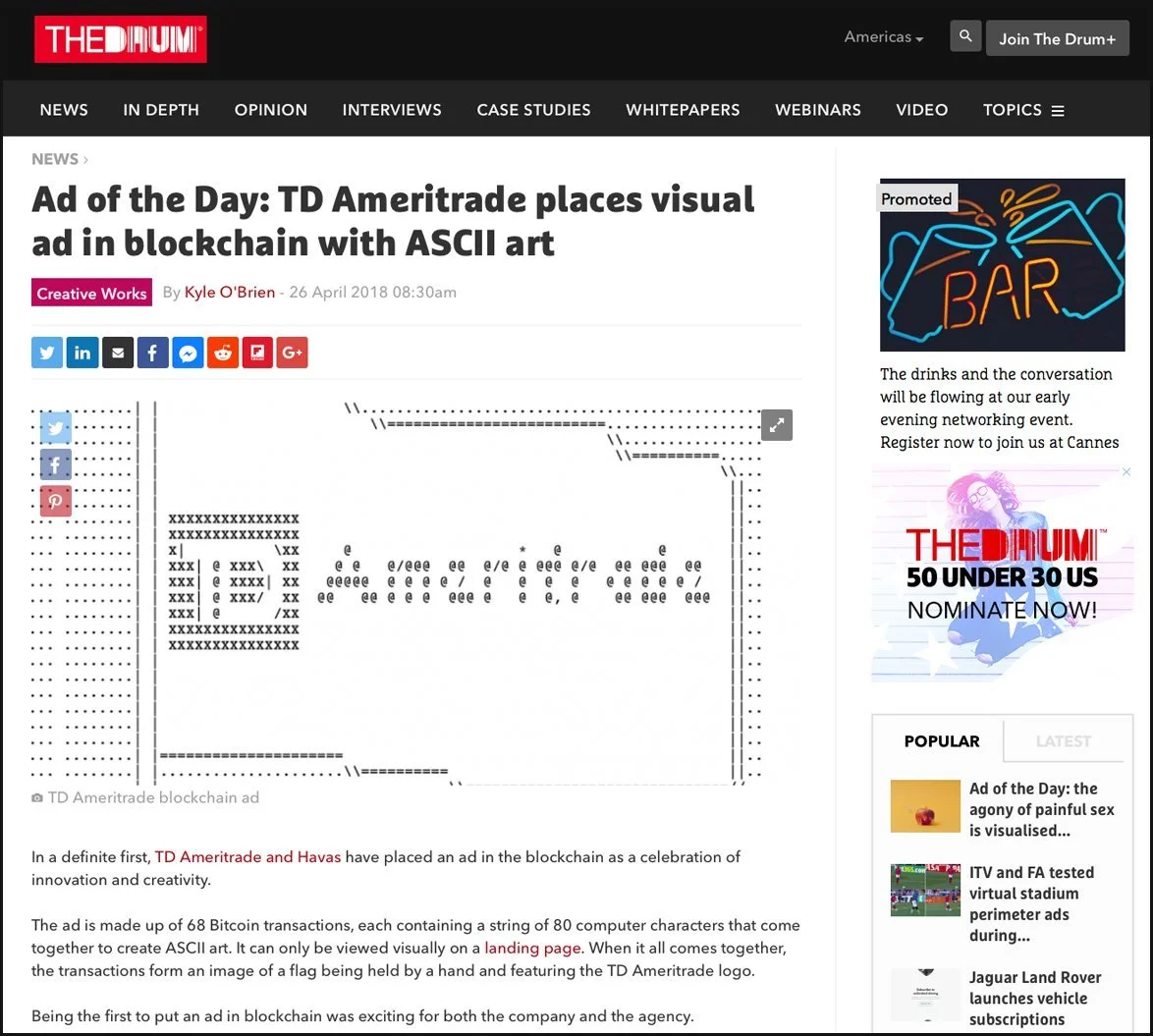 Through a series of transactions, we became the first brand to place an ad in the blockchain. Why? Well, we love finding new ways to use emerging technology. So we decided to have a little fun and plant our flag. Okay–technically, we embedded it. It was awarded with two bronze Cannes Lions and finalist for Titanium.